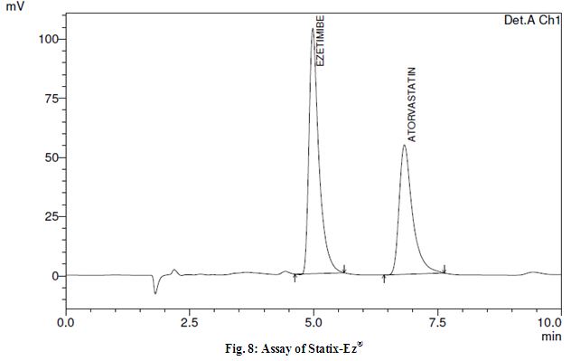 Limit of detection (LOD) and quantification (LOQ) was estimated from signal-to-noise ratio. The limit of detection (LOD) value was found to be 0.0035 µg/ml and 0.0078 µg/ml, and limit of quantification (LOQ) values was 0.0107 µg/ml and 0.0235 µg/ml for ATV and EZT respectively.