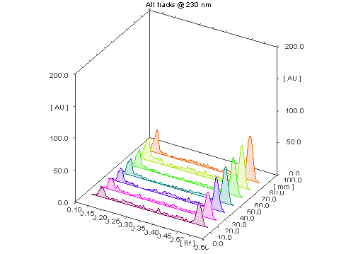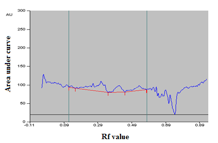 Different mobile phase systems like ethyl acetate: toluene: methanol, ethyl acetate: toluene: methanol: glacial acetic acid, toluene: methanol: ammonia were tried in order to determine the best conditions for the effective separation of alprazolam and fluoxetine HCl. The mobile phase consisting of ethyl acetate: toluene: methanol: ammonia (4:3:1:0.1 v/v/v/v) was selected as it gave high resolution with compact spots at Rf value 0.48±0.04 and 0.17±0.02 for alprazolam and fluoxetine HCl respectively. Also from the overlain spectra, it was observed that both alprazolam and fluoxetine HCl exhibited fairly good absorbance at about 230 nm which was selected as the analytical wavelength for densitometric analysis.