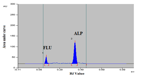 Conclusion: In the proposed method, the rapid, single step extraction of drugs from plasma samples coupled with the simple HPTLC-UV chromatographic conditions makes the method cost effective and suitable for analysis of a large number of binary samples of alprazolam and fluoxetine HCl in plasma.