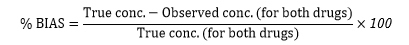 Accuracy and precision were studied by analyzing five replicates of the Lower Quality Control (LQC), Middle-Quality Control (MQC) and Higher Quality Control (HQC) samples. The concentration of alprazolam and fluoxetine HCl in the QC samples was determined by referring to the area ratio of the drug to standard drug dilution, obtained from the QC samples, the calibration equation generated on the same day. The accuracy was estimated as the mean % BIAS while the precision was measured in terms of % CV.The recovery of the extraction procedure was calculated by comparing the peak areas of the processed QC samples to those of corresponding standard dilutions.