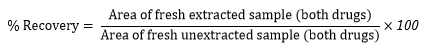 Stability was evaluated under various conditions viz. three freeze-thaw cycles, stability at room temperature for 6 h and long-term stability at -20 °C for one week. For the determination of freeze-thaw stability, five replicates of LQC and HQC samples were frozen at -20 °C for a minimum of 24 h and then allowed to thaw unassisted at room temperature. For short-term room temperature stability, five replicates of LQC and HQC samples were kept at room temperature for 6 h. Long term stability at -20 °C for one week was determined by using five replicates of LQC and HQC. The precision and accuracy of stability samples was found, and the % CV and % BIAS were calculated [16-17].