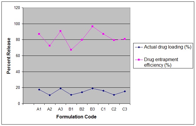 Fig. 2: Comparative percent release study of Actual drug loading and drug entrapment efficiency of formulations A1, A2, A3, B1, B2, B3, C1, C2 and C3 respectively