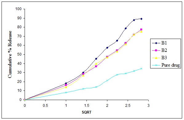 The initial burst release of formulations B1, B2 and B3 were 18.14%, 16.25% and 14.12% respectively after 1 hour and after the end of 8 hours of dissolution, the release of drug from microspheres was 92.15%, 77.61% and 75.33% respectively that is shown in fig. 3b.