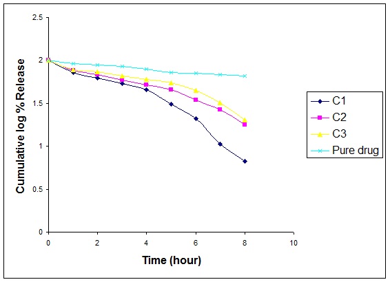 Where, Mt is the amount of drug release after infinite time, K is a release rate constant incorporating structural and geometric characteristics of the mechanism of drug release. To clarify the release exponent batches of microspheres, the log value of percentage drug dissolved was plotted against log time for each batch according to the above equation. A value of n = 0.45 indicates Fickian (case I) release; > 0.45 but < 0.89 for non fickian (anomalous) release: and > 0.89 indicates super case II type of release. Case II generally refers to the erosion of the polymeric chain and anomalous transport (non Fickian) refers to a combination of both diffusion and erosion controlled drug release.