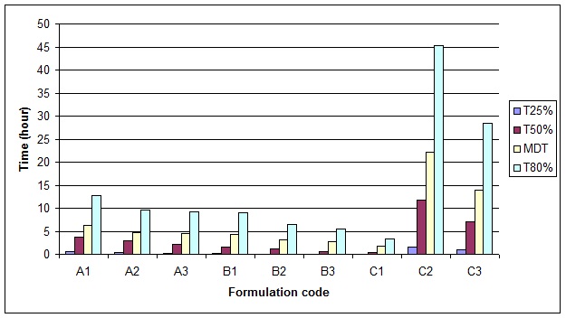To characterize the drug release rate in different experimental conditionals were calculated from dissolution data. MDT of formulations A1, A2 and A3 were found 4.60 hours, 5.16 hours and 5.23 hours respectively. MDT of formulations B1, B2 and B3 were found 4.78 hours, 4.83 hours and 4.00 hours and MDT of formulations C1, C2 and C3 were found 3.59 hours, 4.39 hours and 4.75 hours respectively that is shown in fig. 4 The fig. 4 clearly indicates that higher the polymer level, higher the value ofT25%, T50%, MDT and T80%.