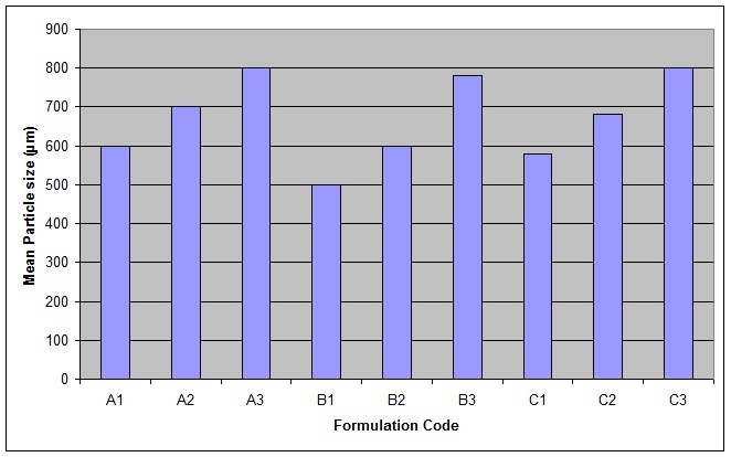 In the present study, the particle size of selected formulations was determined using a Malvern Mastersizer. It is observed from the Figure 8 that increasing the polymer ratio the mean particle size was increased. When the drug polymer ratio was increased form 1:1 to 1:6, larger particles were formed, because the viscosity of the emulsion medium was increased with increasing amount of polymer. Due to increase in viscosity, larger emulsion droplets were formed which were difficult to break and hence they are precipitated as such leading to increase in mean particle size. It was observed from the investigation that when stirring speed was low (500 rpm), larger spherical microspheres were formed. This may be due to inadequate stirring speed which was not able to break the emulsion droplets. Stirring speed above 1500 rpm resulted in formation of spherical small microspheres, which may be due to higher degree of emulsification of the polymeric phase at a higher speed. Hence it confirms that effective drug loading has been taken place in microspheres which increased the particle size of the microspheres.