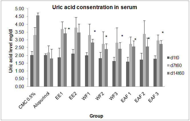 Fig.1: It showsUric acidmean concentration in serum of each group at day 1, 7 and 14.Group I: CMC 0,5%, Alopurinol 9 mg/kg bw, EE: ethanol extract dose 40, 80 and 120 mg/kg bw,WF:Water Fraction dose 18.75, 37.5, and 75 mg/kg bw, EAF:ethyl acetate fraction dose 6.25, 12.5 and 25 mg/kg bw at day 14, n=5