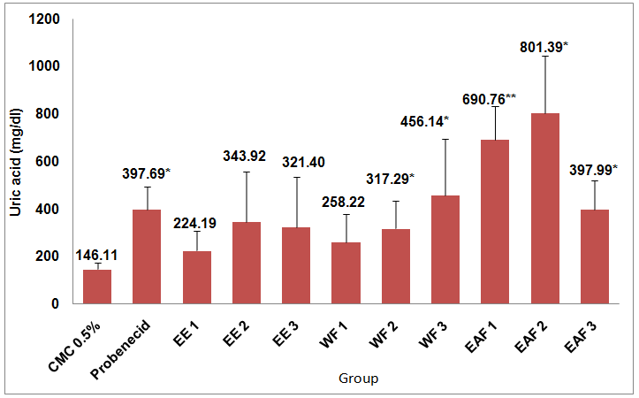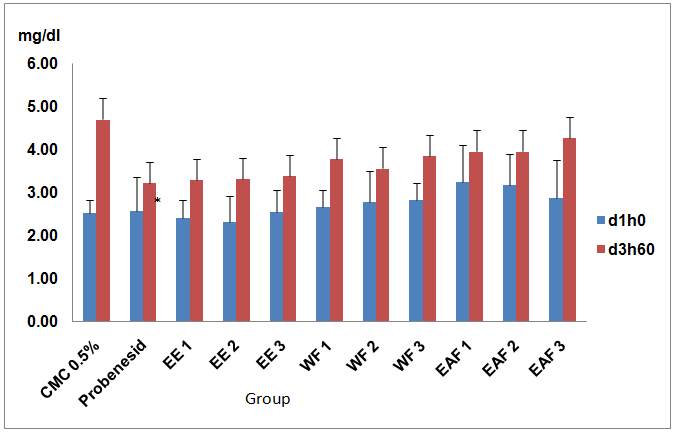 Fig. 3 showed that the levels of uric acid in the urine in the group probenecid significantly higher compared to control, so with the as w water and ethyl acetate fraction.